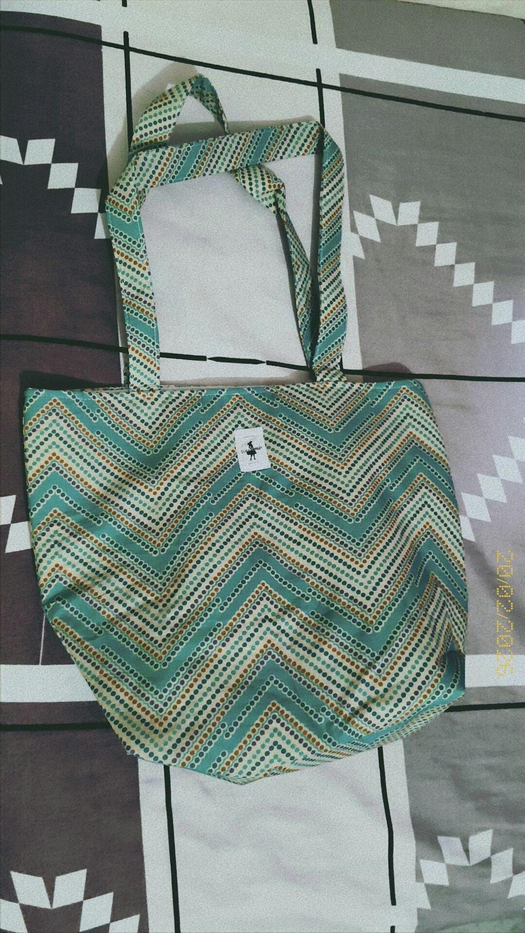 Elevate your everyday style with this beautifully crafted Teal Chevron Cotton Tote, designed for women who love effortless fashion with a touch of sustainability. The elegant zigzag pattern blends modern aesthetics with a handcrafted feel, making it the perfect companion for daily errands, college, office, or casual outings.